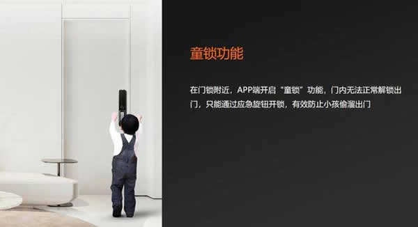 “童鎖”功能是一些電子產品為了保障兒童安全而推出的人性化功能設計。當童鎖功能啟用時,操作鍵會暫時失去其控制功能,這就避免了兒童因好奇誤操作而導致的危險。在智能鎖產品中,童鎖功能開啟后,門內則無法通過常規的雙重感應方式開門,只能通過應急旋鈕的方式開鎖,給孩子們的居家安全又加了一道保障。